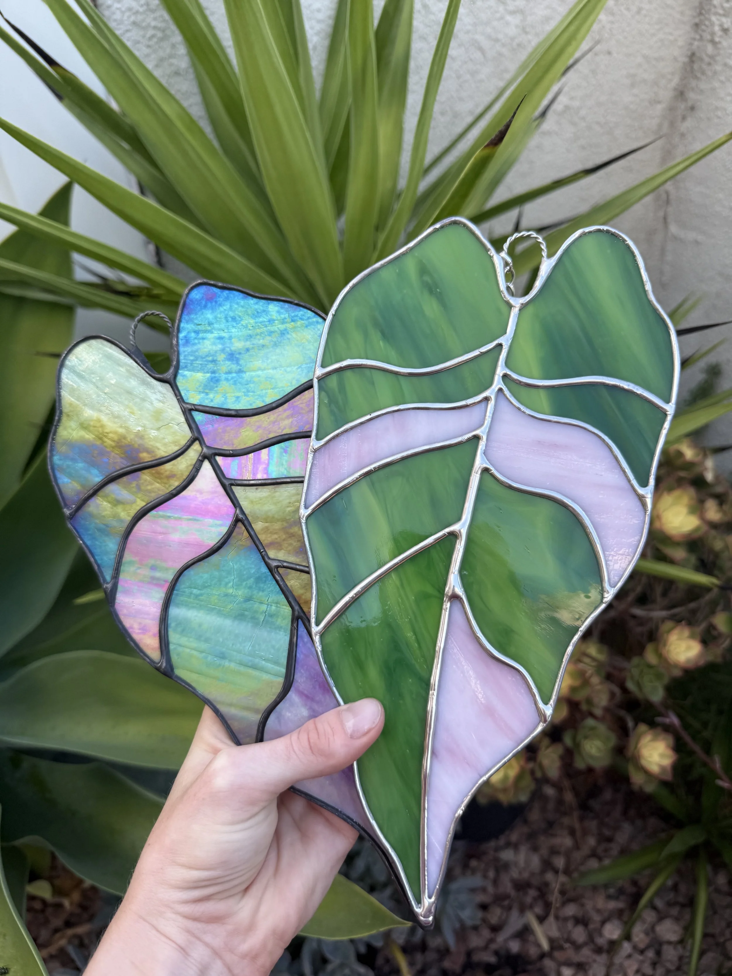 Pink and green stained glass leaf inspired by the beautiful Pink Princess Philodendron plant. Each leaf is unique due to variations in the glass patterns. Chain not included.